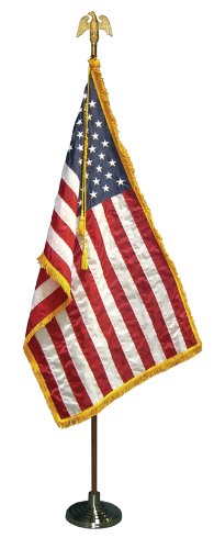 3' x 5' U.S. American Nylon Flag Embroidered Stars Sewn Stripes Made with Pole Hem &Gold Fringe Gold Metal Spear Ornament 2 Piece 8' x 1-1/4" Oak Pole Brass Screw Joint Shiny Gold Plated Regent Floor Stand Gold Tassel - Ships Fast UPS